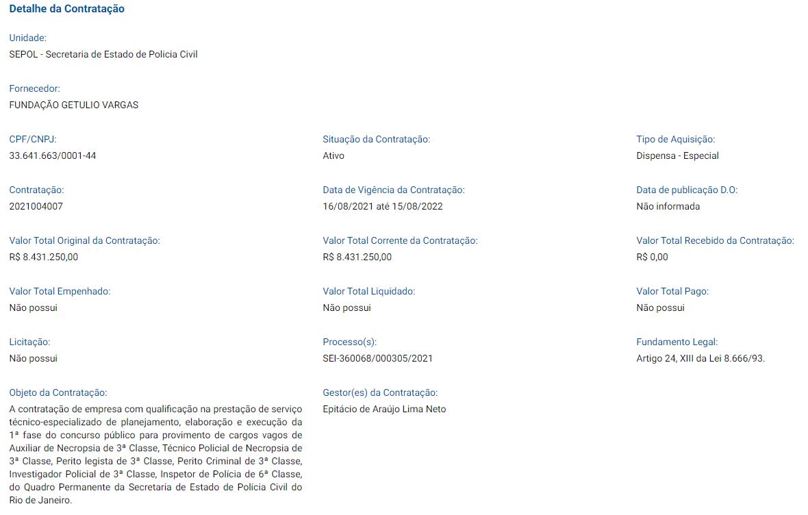 Além disso, de acordo com o portal de compras a banca Fundação Getúlio Vargas foi contratada. Confira: