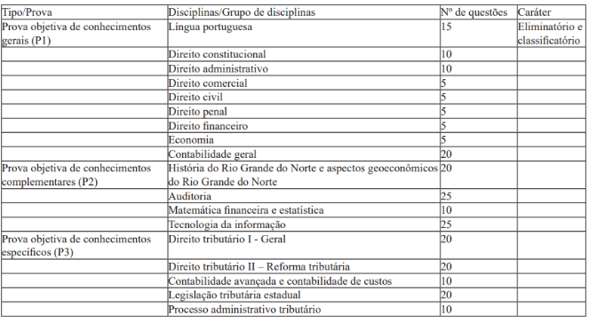 O certame contará com três provas objetivas, de caráter classificatório e eliminatório. Todas elas serão aplicadas entre os dias 21 e 22 de março. Os exames serão compostos por questões de múltipla escolha, com cinco opções(A, B, C, D e E), com o valor de 240,00 pontos. Confira o conteúdo da prova:
